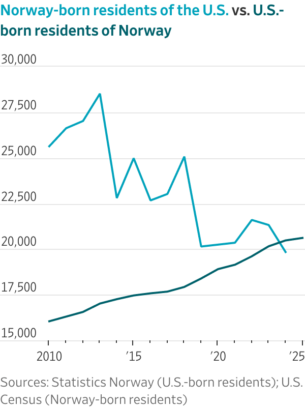 More Americans now live in Norway than Norwegians live in the U.S. Data on American emigration to Europe shows sharp upticks across multiple countries — France, Ireland, Portugal — with the U.S.-born population in Norway now crossing above the Norway-born population in the United States. (Schubert / Brookings)