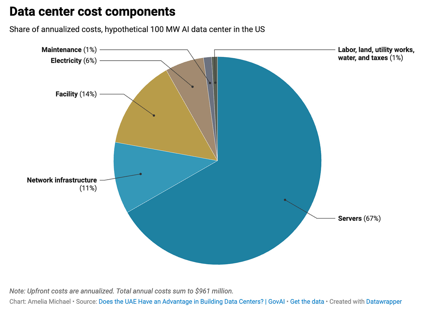 Chips account for two-thirds of what it actually costs to build and run an AI data center. Breaking down the annualized costs of a hypothetical U.S. facility, servers alone represent 67% of total costs and networking infrastructure another 11%. Electricity — the cost most often cited as the data center story — comes in at just 6%. Labor is 0.5%, land 0.3%, water 0.05%. Public discourse around power consumption and land use as the binding constraints on AI buildout may be looking at the wrong line items. (Amelia Michael / Amelia's Substack)