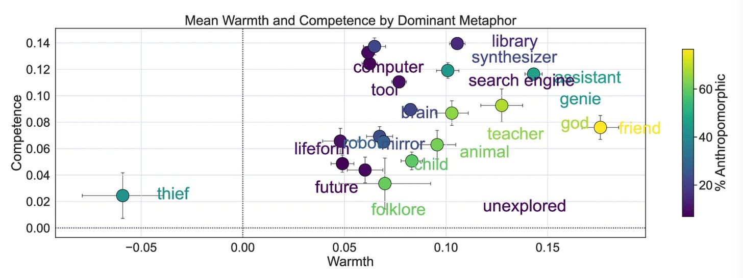 How people “metaphorize” AI is shifting (in a friendlier direction) and strongly predicts whether they'll trust it. Analyzing over 12,000 open-ended metaphors from a year-long nationally representative U.S. survey, researchers found that Americans increasingly describe AI in warm, human-like terms — “assistant,” “friend,” “teacher” — rather than cold mechanical ones. The metaphor someone uses turns out to be a strong predictor of trust and adoption: “thief” strongly predicts rejection, while “brain” and “god” predict higher trust and more use. (Cheng et al. / Nature Communications Psychology)